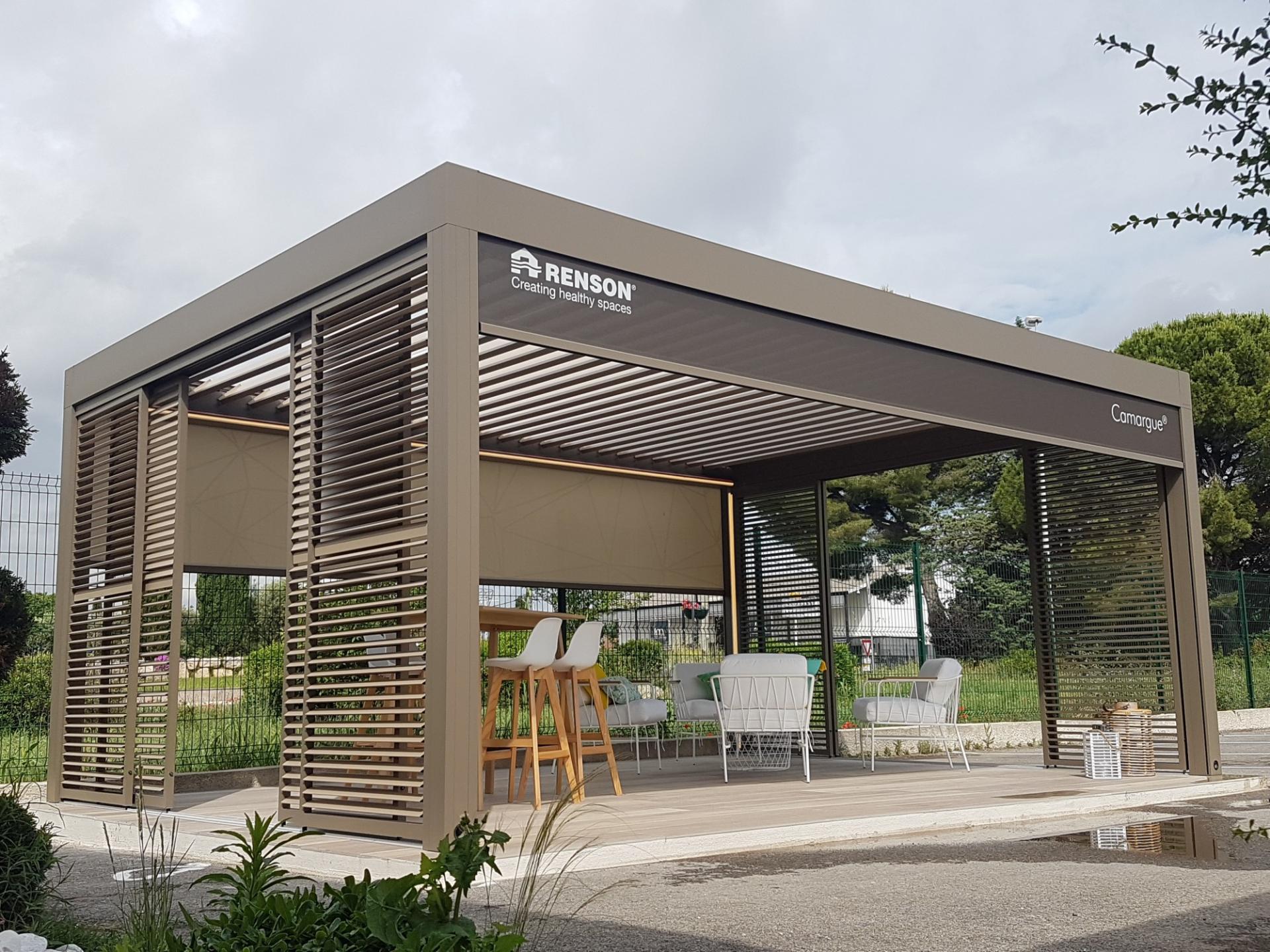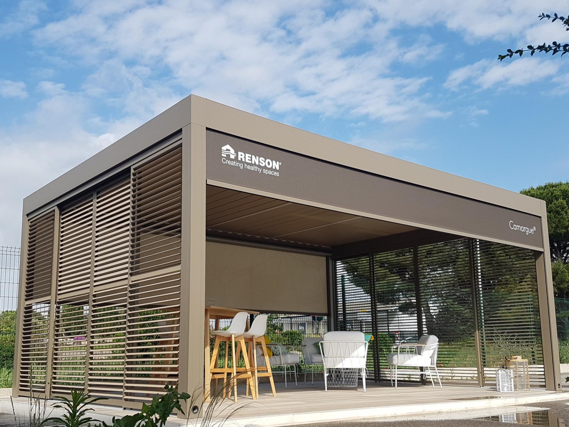 Nous vous invitons à découvrir la pergola en aluminium avec lames orientables CAMARGUE de RENSON ! Grâce à ses accessoires intégrés, vous allez pouvoir profiter de votre extérieur en toute saison et du matin jusqu'au soir.