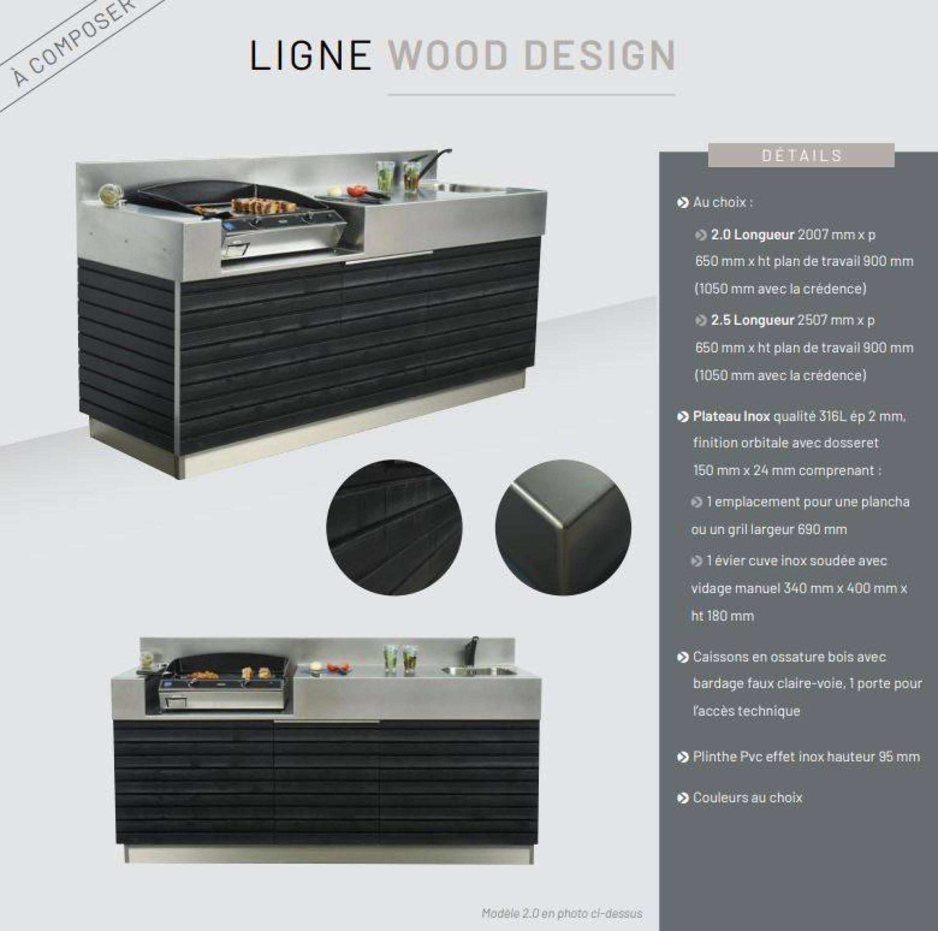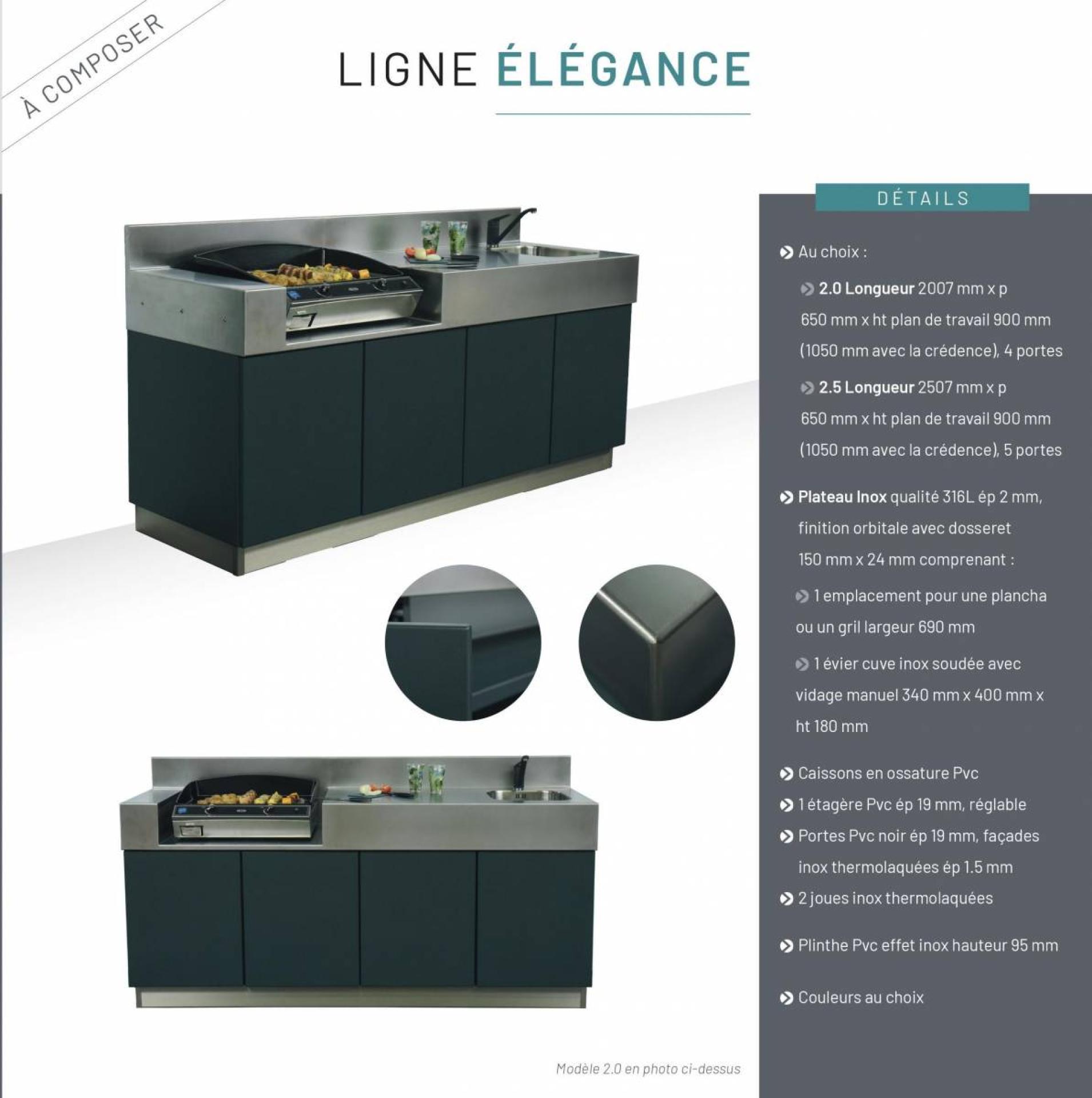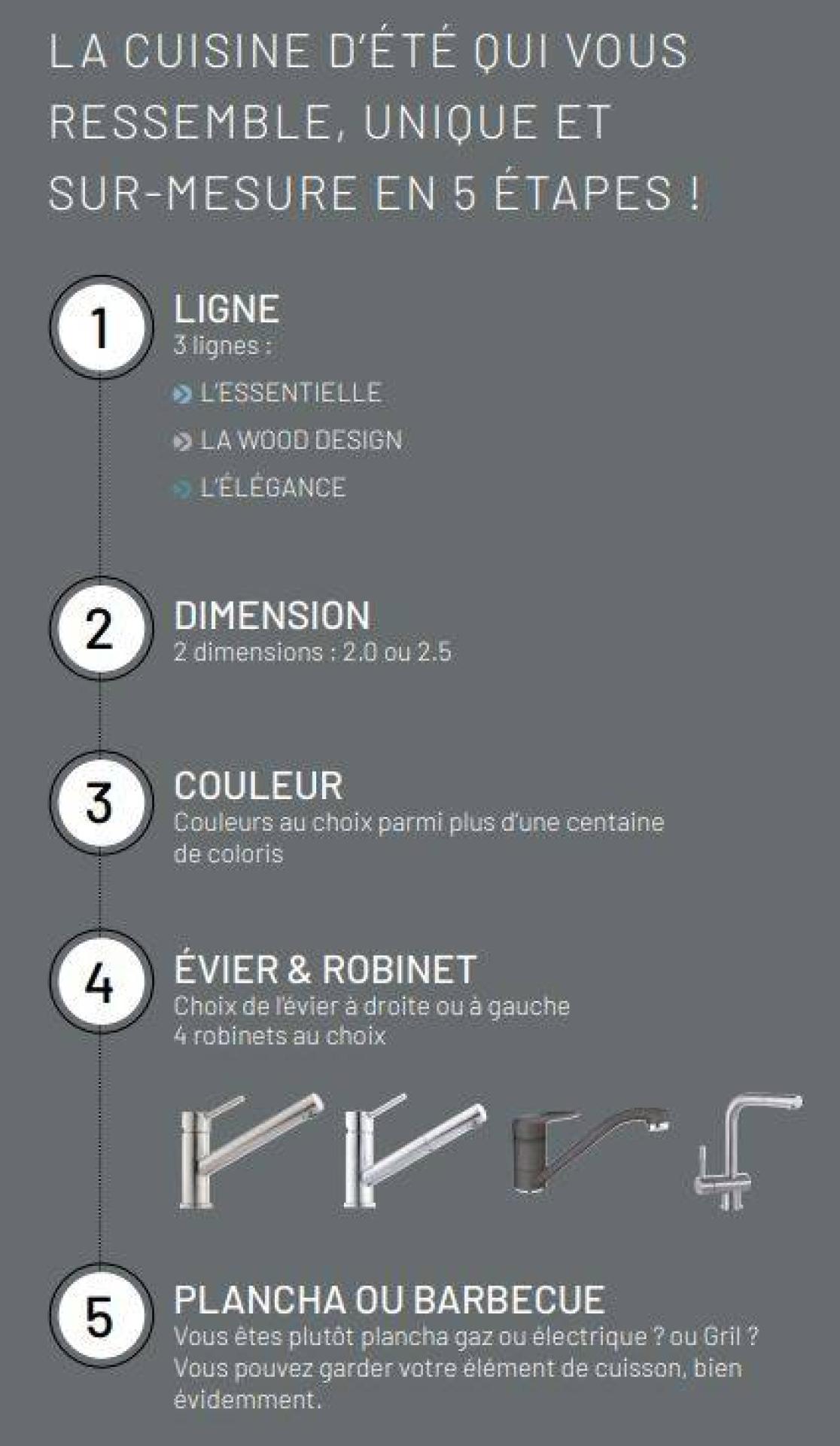 terrasse, sous une protection solaire comme une pergola bioclimatique ou à toile rétractable, ou encore sous un store.Une cuisine d'été qui vous ressemble, unique et sur mesure en 5 étapes :1- La ligne : ESSENTIELLE, WOOD DESIGN ou ELEGANCE2- Dimensions : longueurs au choix 2 m ou 2.50 m3- Couleur : au choix parmi plus d'une centaine de coloris4- Evier & robinet : choix de l'évier à gauche ou à droite & 4 modèles de robinets au choix5- plancha ou barbecue ?Nos modèles,