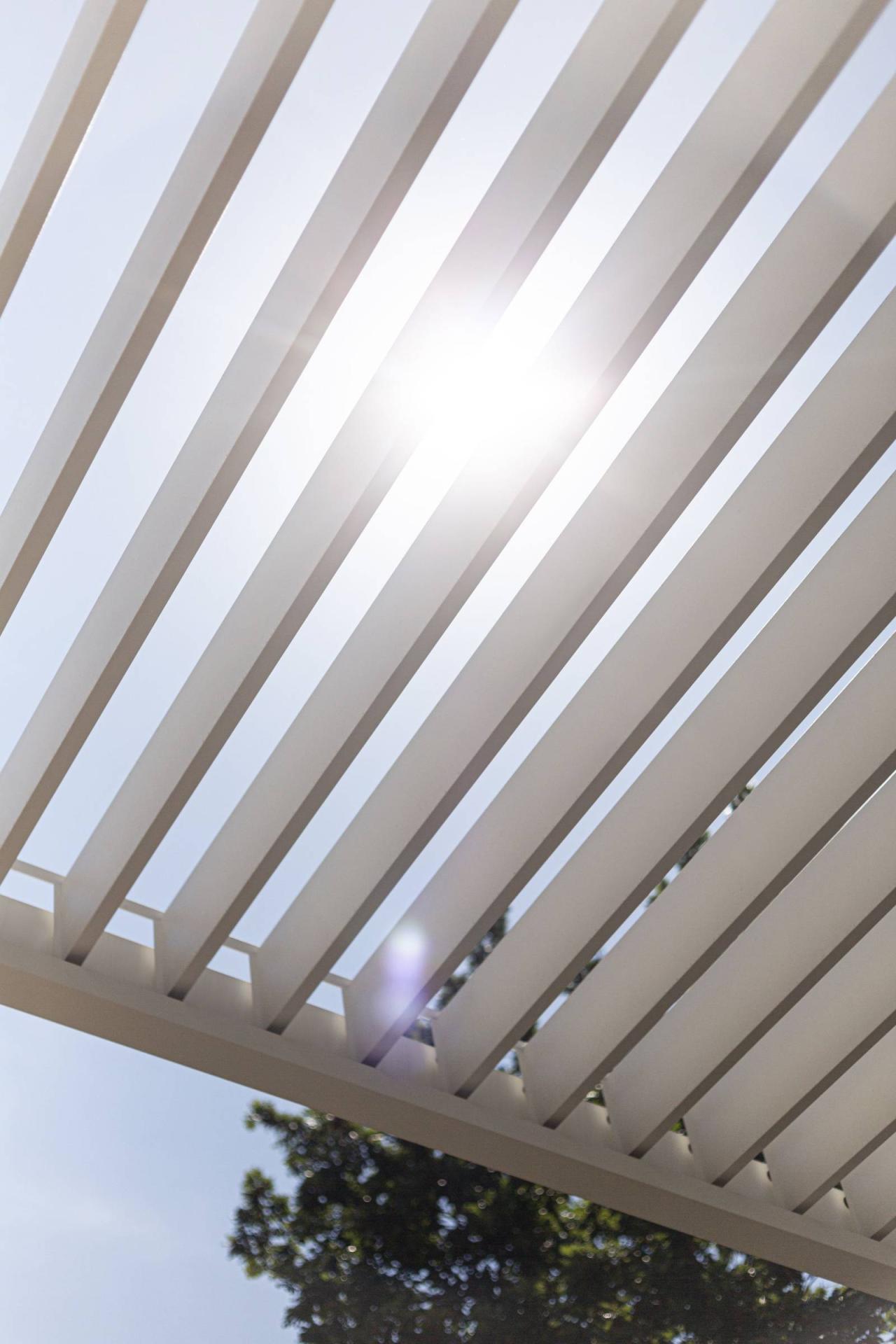 - Toiture en lames orientables aluminium réglable jusqu’à 150°, donnant un contrôle complet sur la quantité de lumière et d’ombre souhaitée et également sur la ventilation passant ou non au travers des lames.