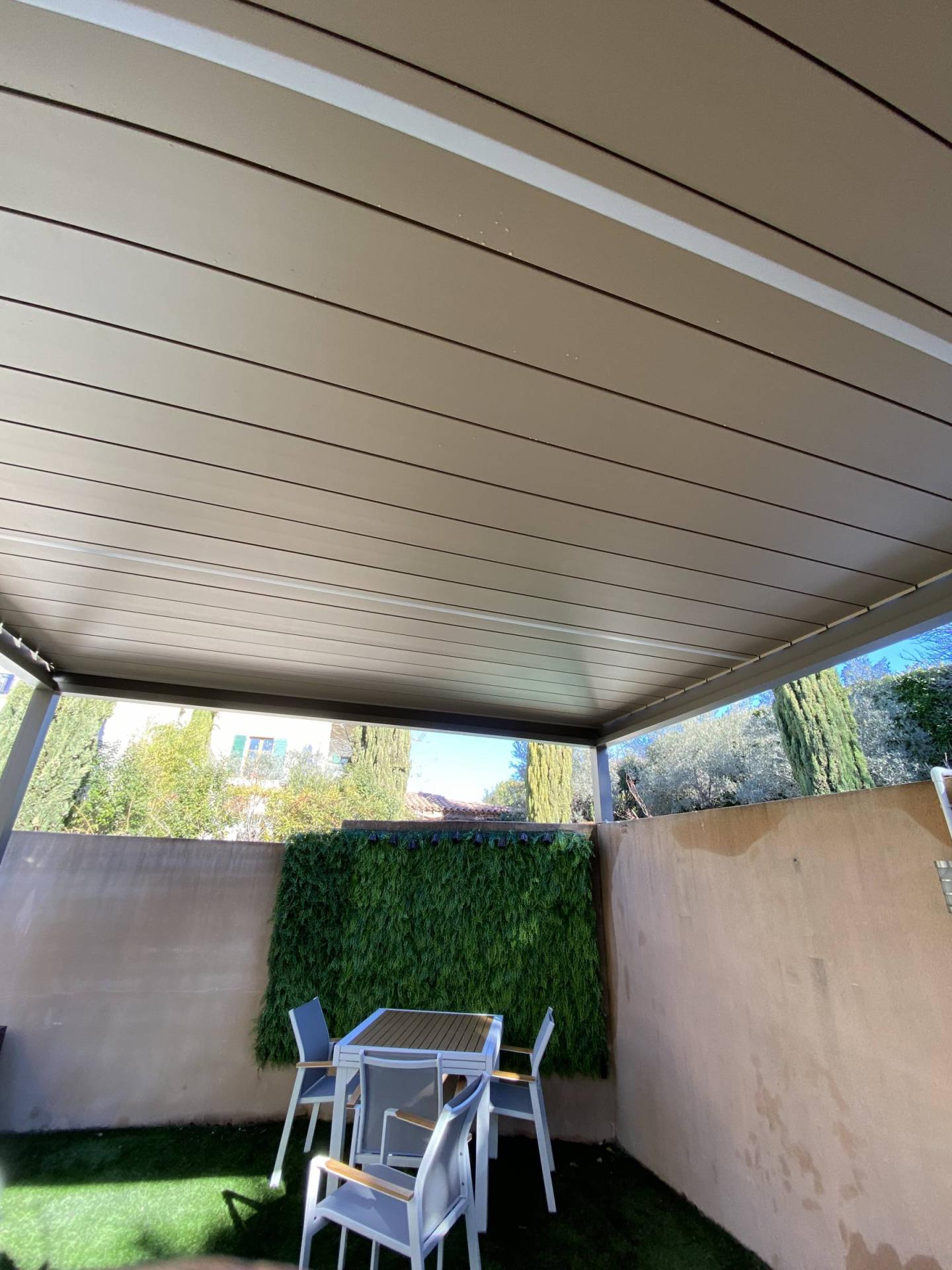 Notre pergola posé à Eguilles est combinée avec deux lames LED intégrées avec capteur de pluie permettant à la fois d’éclairer et de créer une ambiance chaleureuse mais aussi grâce aux capteurs de fermer automatiquement les lames en cas de pluie importante.