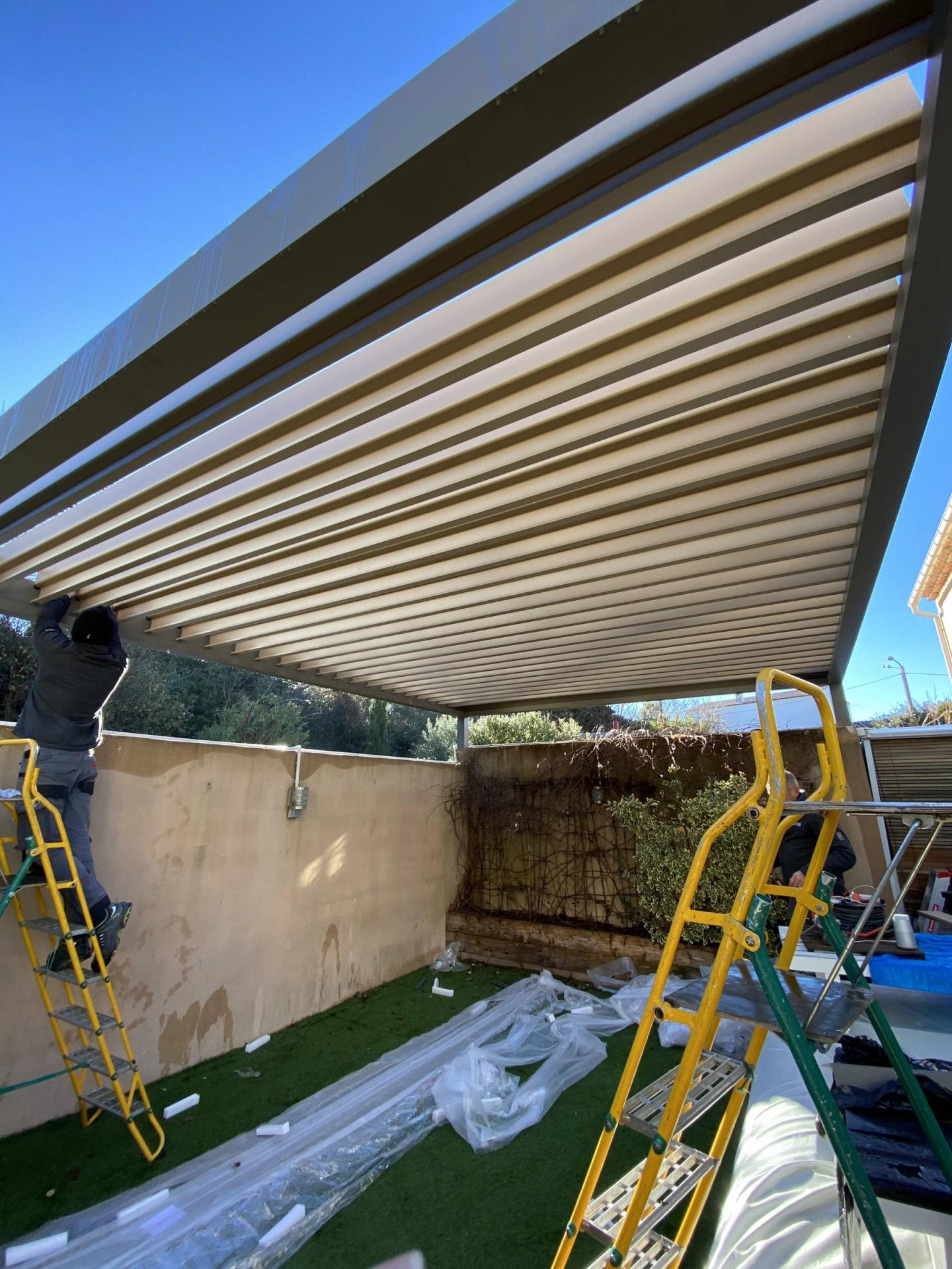 La pergola bioclimatique posée ici fait 5430 mm de longueur sur 4180 mm de largeur. Les couleurs choisies sont deux nuances différentes de taupe (RAL 7006 et RAL 1019) pour la structure puis pour les lames.