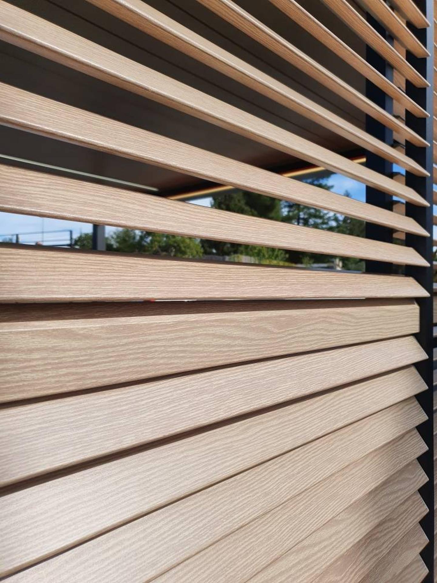 Les lames orientables Wooddesign de Renson reproduisent fidèlement l'apparence du bois grâce à un thermolaquage structuré inaltérable. Disponibles en trois finitions élégantes — chêne blanc, chêne naturel et noyer — elles apportent une ambiance chaleureuse à votre pergola, tout en bénéficiant des avantages de l'aluminium : résistance aux intempéries, durabilité et entretien minimal.