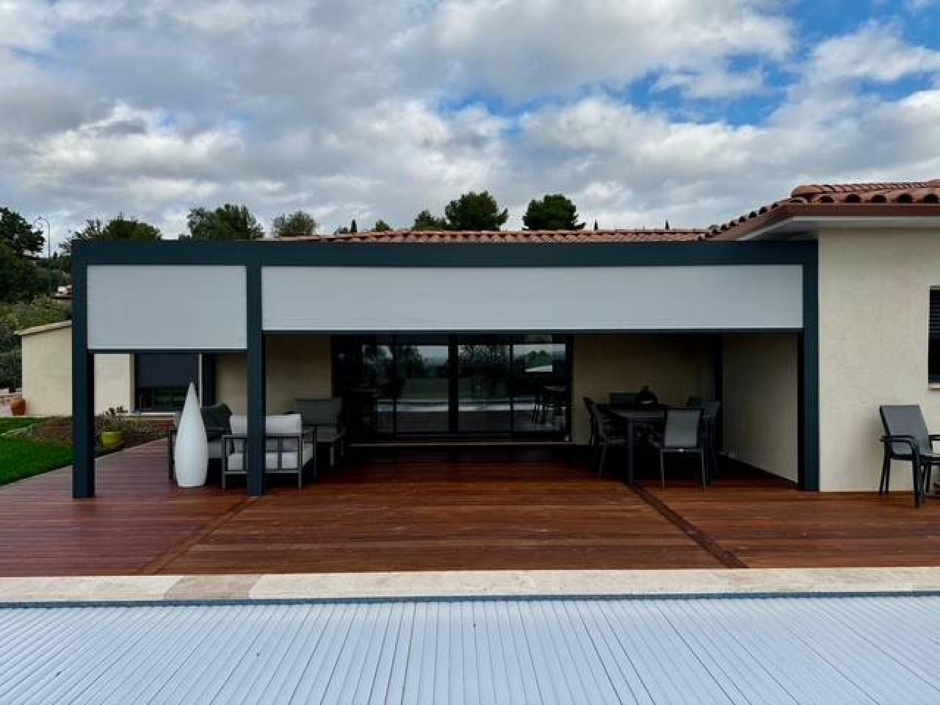 - Une pergola bioclimatique CAMARGUE en aluminium dont les dimensions sont : 6140mm par 3690 mm, installer en façade sur 2 pieds.