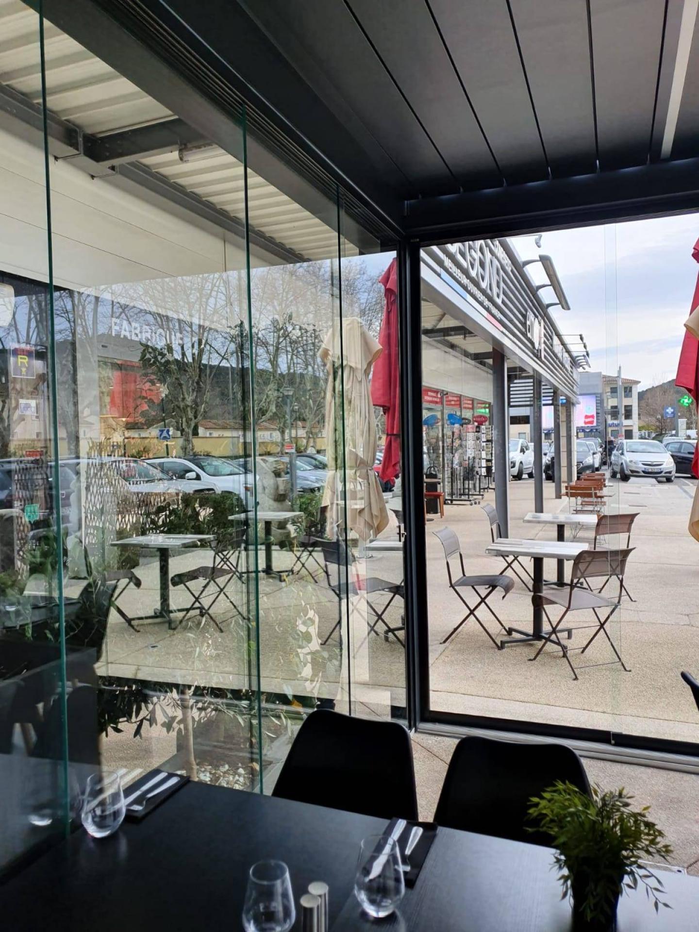 La terrasse initiale n'était pas couverte, ni abritée du vent, de la pluie ou du froid, ce qui réduisait le nombre de couverts en cas de mauvaise météo. Pour agencer sa terrasse nous lui avons proposé l’installation d’une pergola bioclimatique à lames orientables sur mesure, modèle CAMARGUE, afin de créer un espace supplémentaire étanche pour recevoir ses clients et de disposer de cette surface quelle que soit la saison.