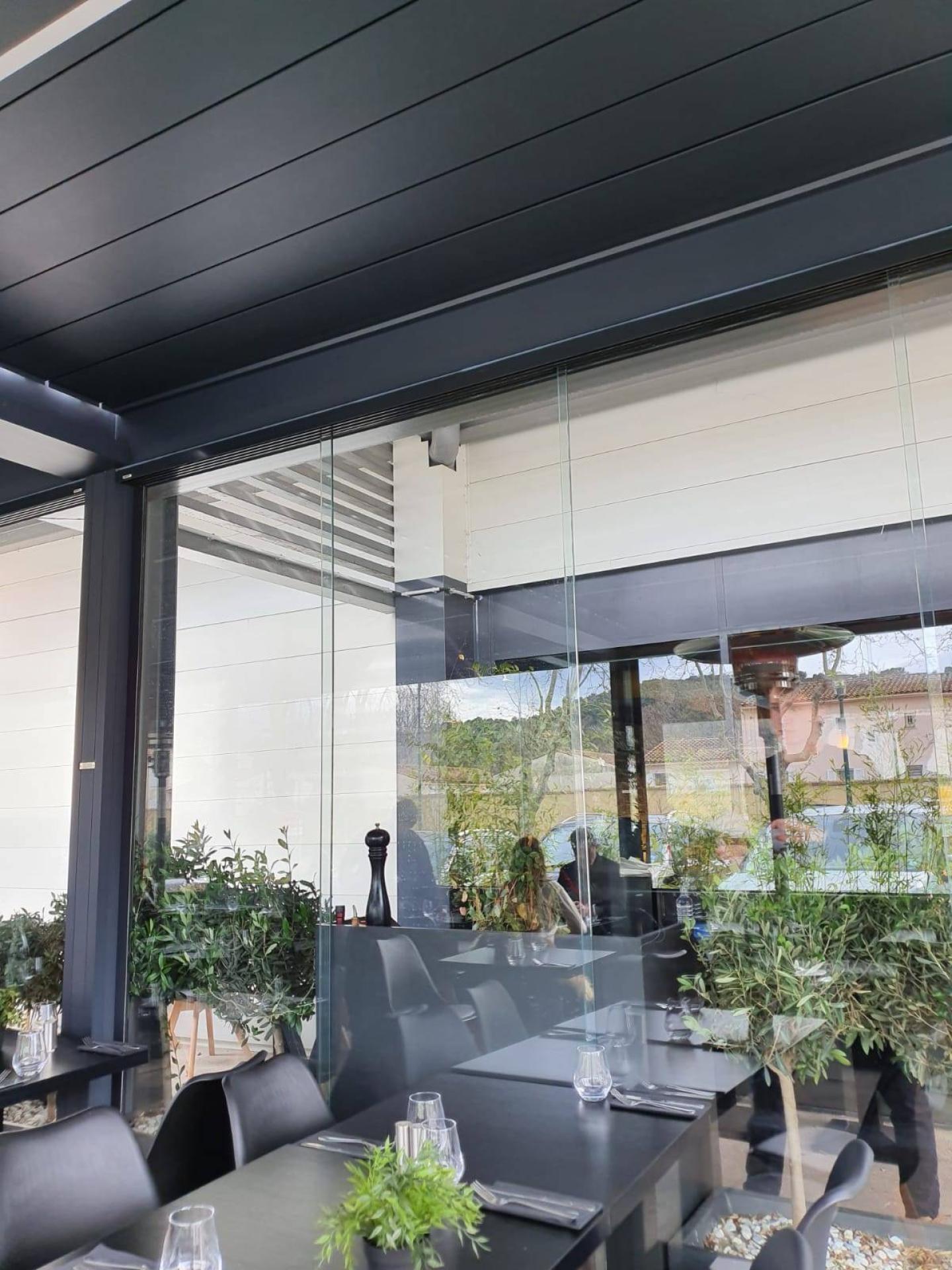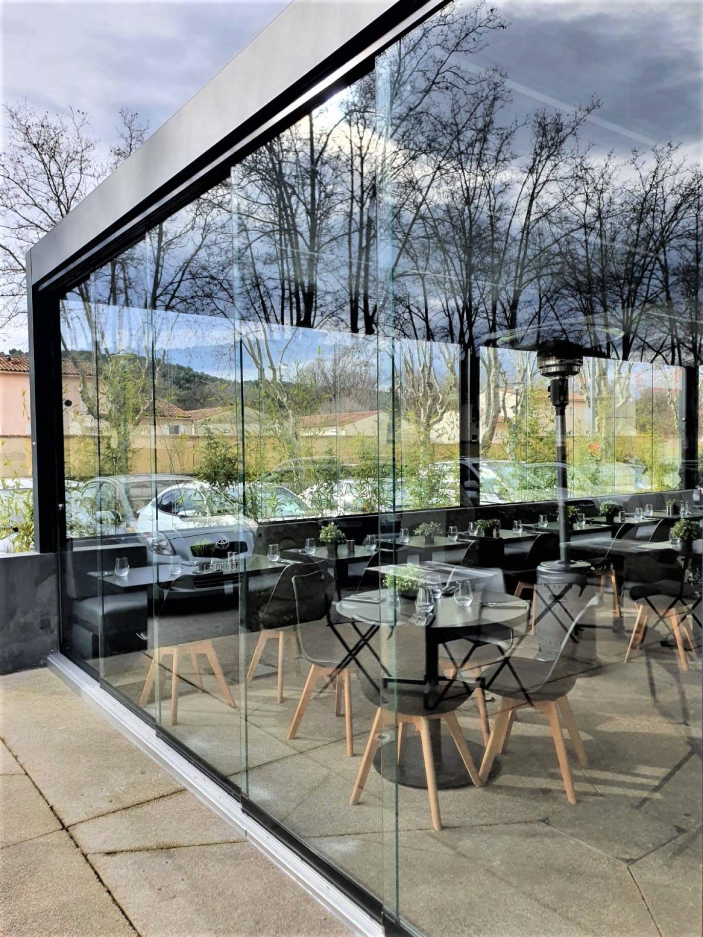Des portes coulissantes en verre sur mesure ont été installées sur les 4 côtés de la structure pour protéger les clients de la pluie ou du froid, tout en conservant la vue sur l'extérieur avec la lumière naturelle du jour. Lorsque la météo le permet, ces parois vitrées sur mesure offrent une ouverture totale pour profiter pleinement de l'extérieur.
