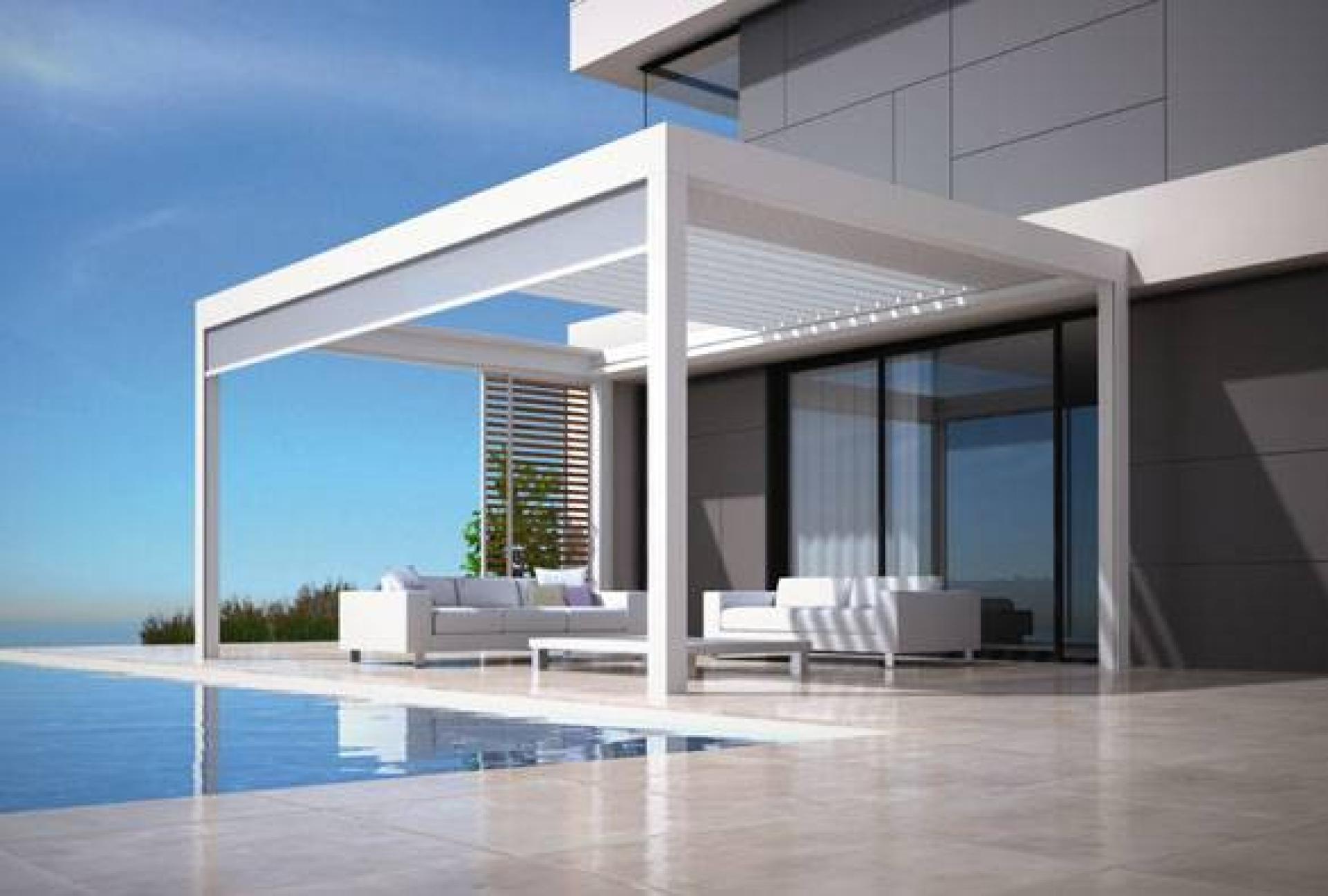Vous avez en effet la possibilité d’équiper cette pergola aluminium bioclimatique de nombreuses options : stores extérieurs verticaux résistants au vent, porte coulissante repliable en verre, persienne de pergola ...