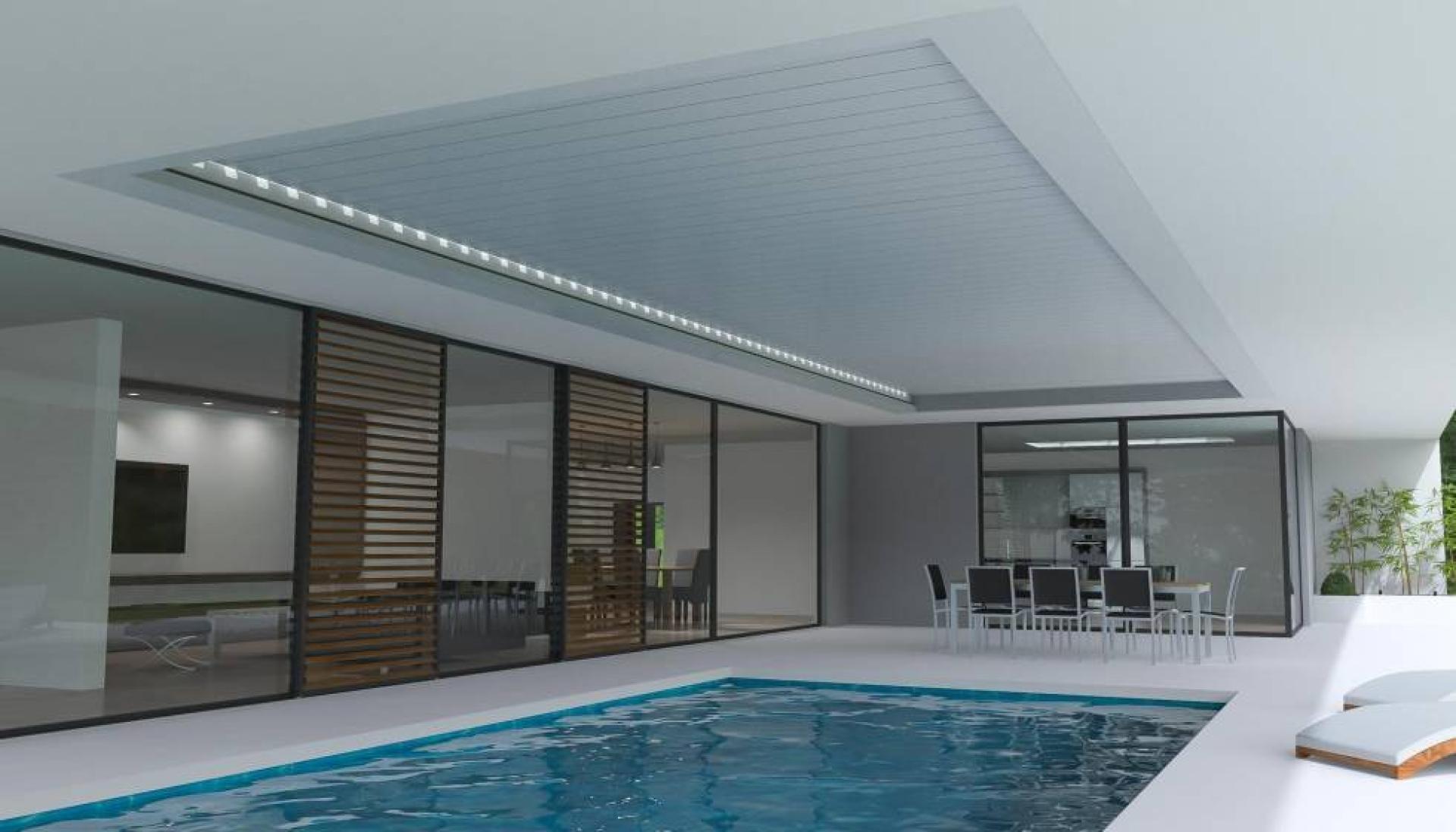 Entièrement personnalisable, le modèle SKYE est une pergola bioclimatique sur mesure qui apporte un véritable cachet à une habitation.
